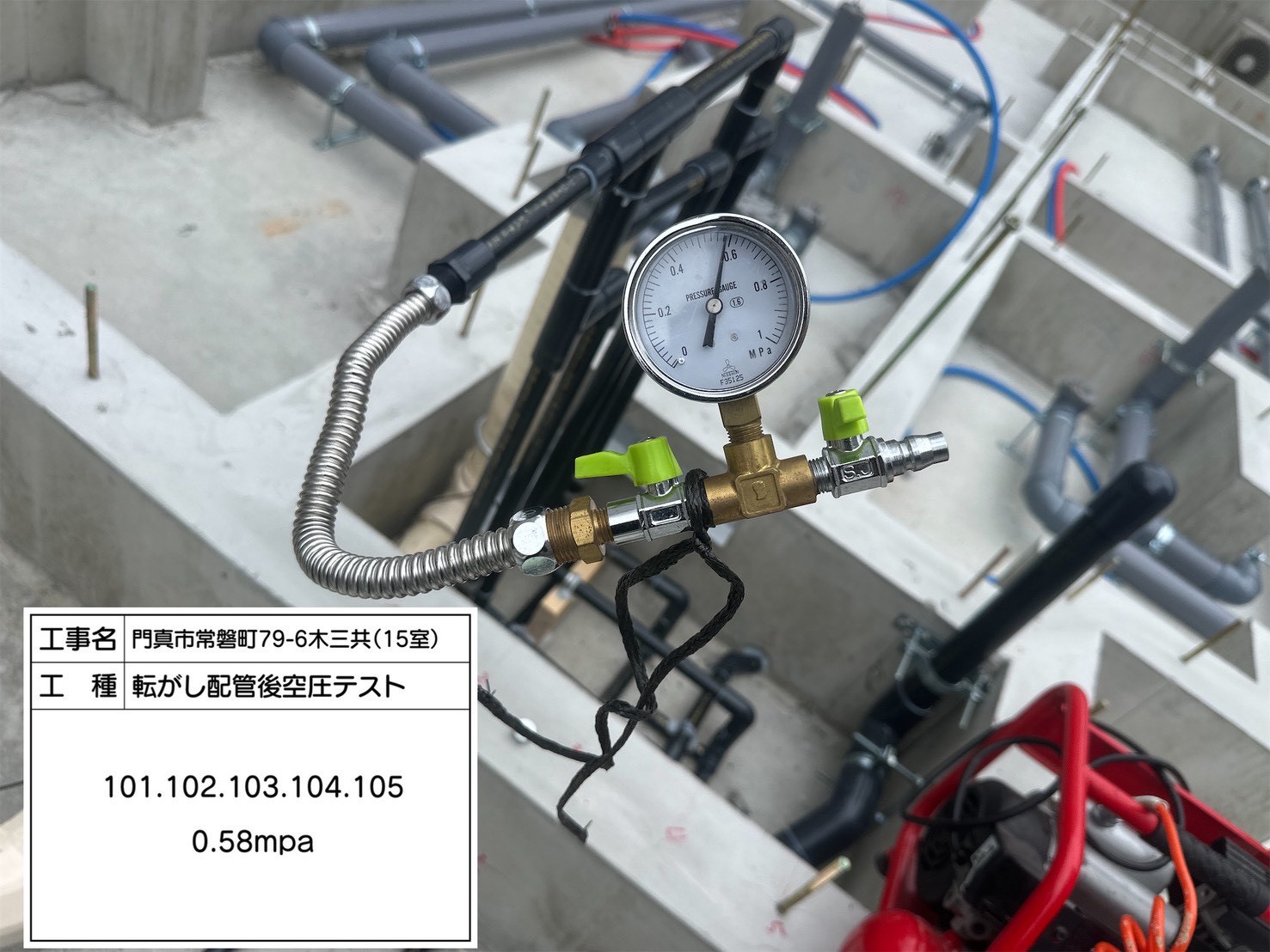 配管施工後は必ず 空圧テスト を実施。